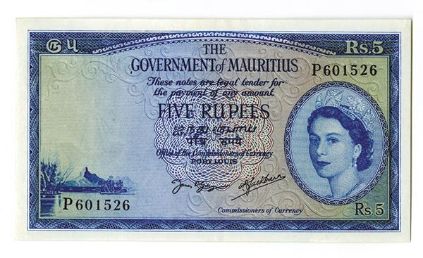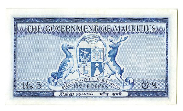 Mauritius, 5 Rupees, P-27, Queen Elizabeth II at right, light vertical fold in middle, note appears Choice XF to AU condition. BWC.
