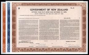 1953, Three specimen bonds: 15 year 5.75% bond with brown border by Federated Banknote Co. (minor edge wear at R),10 year 7% bond with blue border by DeLa Rue and 20 year 6.5% bond with orange border by De La Rue, F-EF