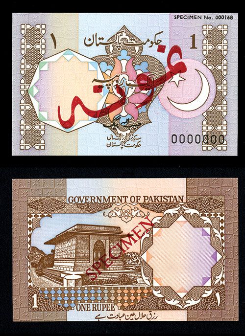 Pakistan, ND (1982), 1 Rupee, P-26b Specimen banknote, S/N 000000 on lower right. Dull brown on m/c, “Specimen No.000168” on top right margin, Specimen overprints, Choice to Gem Uncirculated.