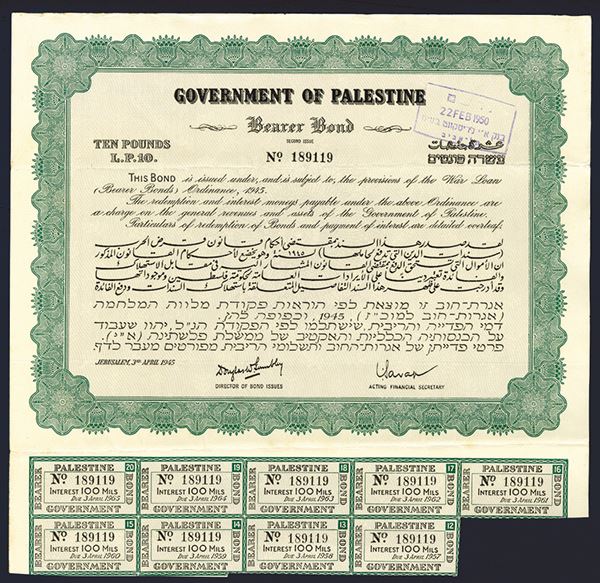 Jerusalem, Palestine, 1945, 10 Pounds, Second Issue Government of Palestine Bearer Bond, Black on green border and underprint with no vignette, VF condition.