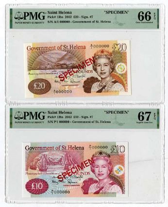 Saint Helena, 2012. Lot of 2 Specimen Banknotes, Includes: 10 Pounds, P-12bs & 20 Pounds, P-13bs, Pair of Specimen Banknotes, Both notes have m/c printing with Queen Elizabeth II at right, S/Ns P/1 000000 & A/1 000000, Both notes are PMG graded Superb Gem Uncirculated 67 EPQ & Gem Uncirculated 66 EPQ. (2). Sold "AS IS" no returns accepted.