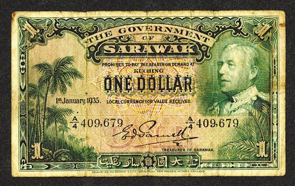 Sarawak. 1 Dollar. P-20. C. Vyner Brooke at right, arms at center on back. Fine to Choice Fine. (The Silicon Valley Collection)