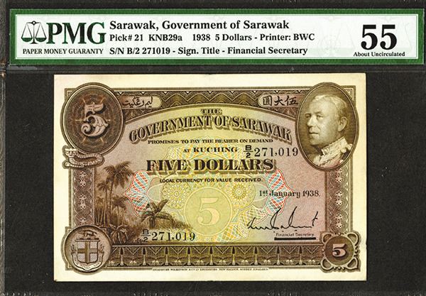 Sarawak. 5 Dollars. P-21. KNB29a. C. Vyner Brooke at top right. PMG graded About Uncirculated 55, minor surface damage.
