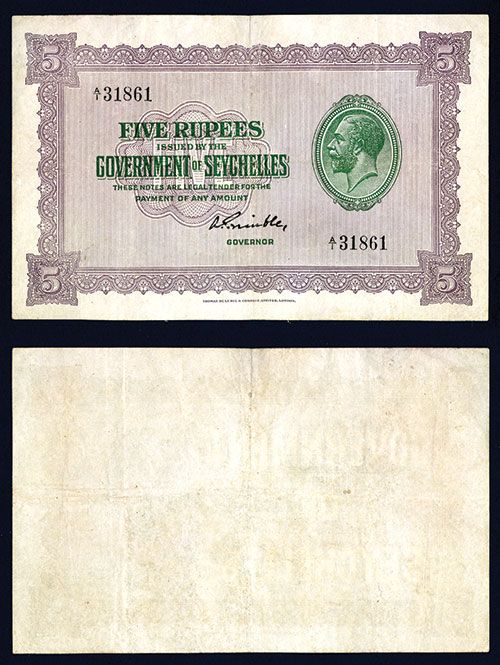 Seychelles, ND (1936), 5 Rupees, P-3c, Issued banknote, Lilac brown and green, S/N A/1 31861, VF to VF+ condition. TDLR.