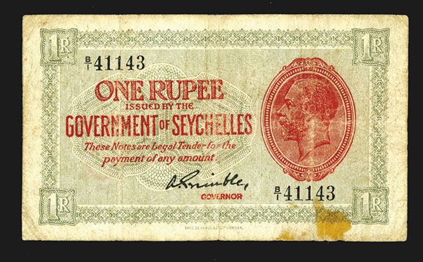 Seychelles, ND (1936), 1 Rupee, P-2f, Issued banknote, Gray and red, S/N B/1 41143, PMG graded Choice Fine 15 NET with note of light stains, rust and annotations on back, TDLR.