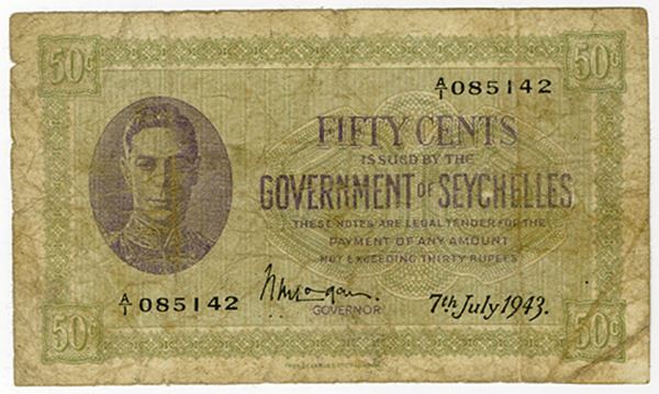 Seychelles, 1943. 50 cts, P-6a, Issued banknote, grayish green and violet, King George VI at left, S/N A/1 085142, Choice VG to Almost Fine. TDLR.