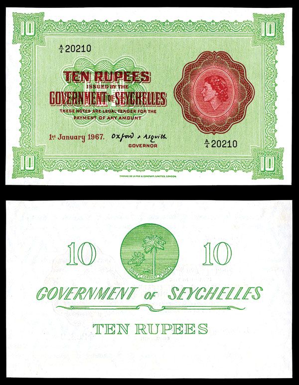 Seychelles, 1st January, 1967, 10 Rupees, P-12d, Issued banknote, Red on green, Queen Elizabeth II on right, S/N A/4 20210, Choice to Gem Uncirculated Condition and rarely seen this nice, This is also the Pick Plate note in the SCWPM. TDLR