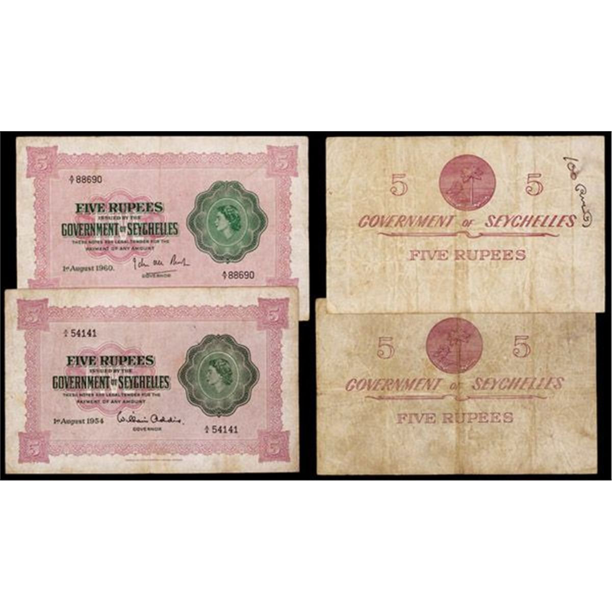 Seychelles, 1954, Lot of 2 notes, Both are 5 Rupees, P-11, One is dated 1954 and the second is dated 1960, Both are lilac and green with Queen Elizabeth II on right, Fine to Choice Fine condition. TDLR.