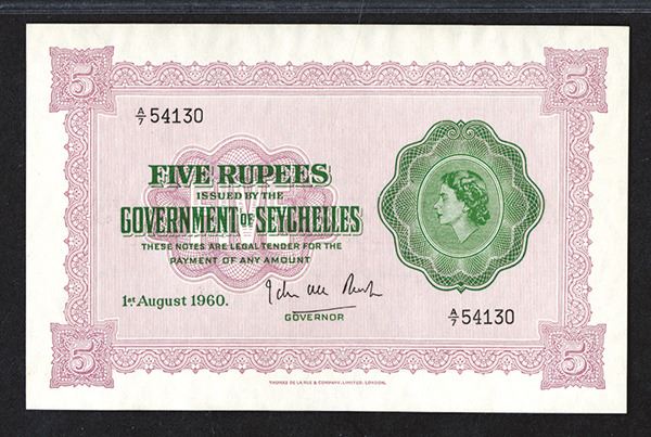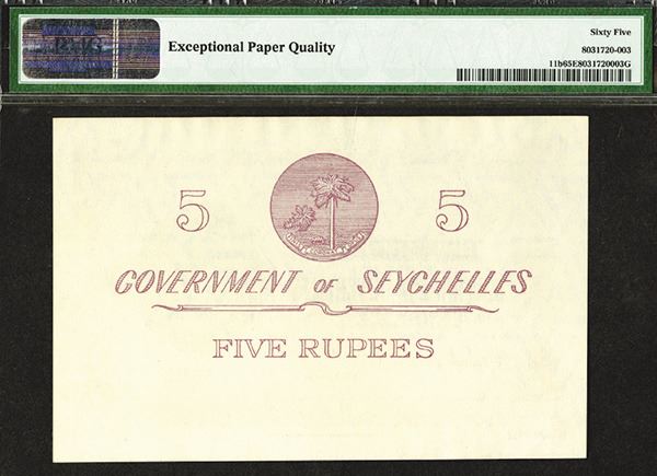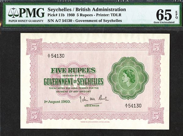 Seychelles, 1st August, 1960, 5 Rupees, P-11b, Issued banknote, S/N A/7 54130, Uniface, Queen Elizabeth at right, light purple on white paper. PMG graded Gem Uncirculated 65 EPQ. Rarely seen this nice. Attractive note. TDLR. (Silicon Valley Collection)