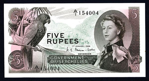 Lot of 2 notes, Includes, 5 Rupees, P-14a, Dark brown on m/c, Queen Elizabeth on right with parrot on left, Choice to Gem Unc.; and 10 Rupees, P-15a, Blue on m/c, Queen Elizabeth on right with sea tortoise on left, , S/N A/1 344201. AU to Choice AU condition, This is also the Pick Plate note in the SCWPM. BWC.