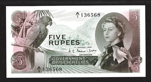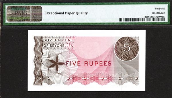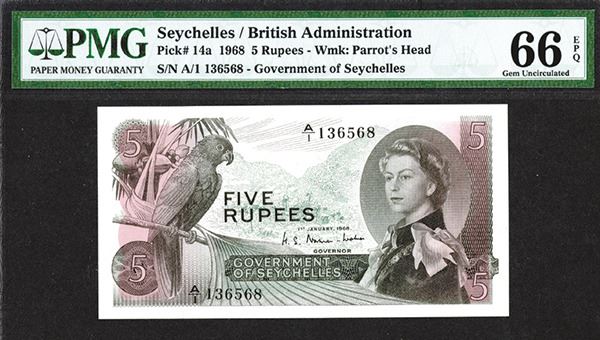 Seychelles. 5 Rupees. P-14a. Elizabeth II at right end, parrot at left. PMG graded Gem Uncirculated 66 EPQ.