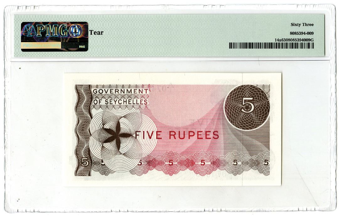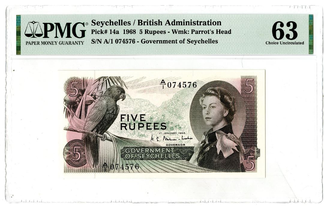 Seychelles/British Administration. 1968. 5 Rupees - Watermark: Parrot's Head, P-14a, Issued banknote, Multicolor with Elizabeth II, S/N A/1 074576, PMG graded Choice Uncirculated 63 with comment "Tear".