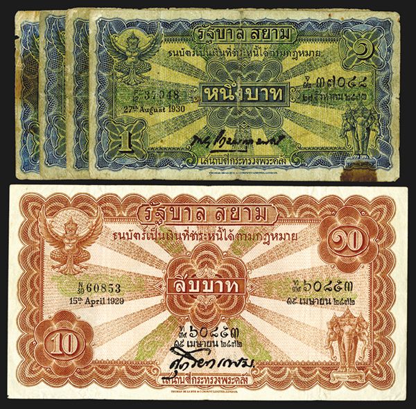 Thailand, Lot of 5 notes, Includes 1 Baht, P-16b (4), various dates between 1930 and 1933, VG to Fine; and, 1929, 10 Baht, P-18b, VF to Choice VF with large even margins and sharp corners. (5)