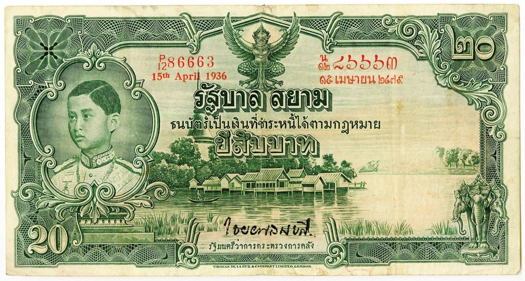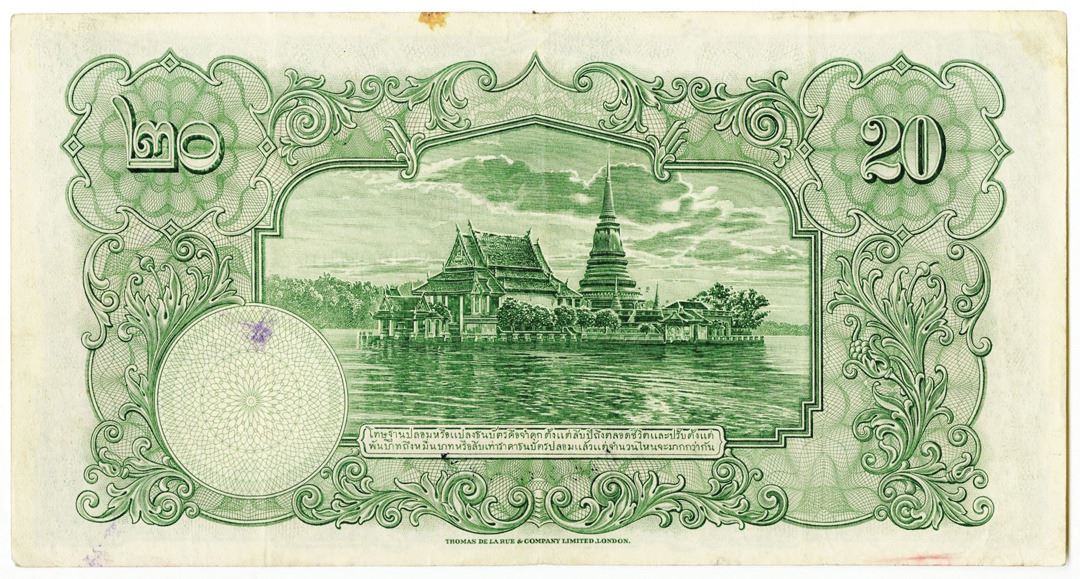 Thailand. 1936. 20 Baht, P-29, issued banknote, sign. #15, Green on pink underprint, S/N p/12 86663, VF with minor toning spots, TDLR. (From the Allen Berk Collection)