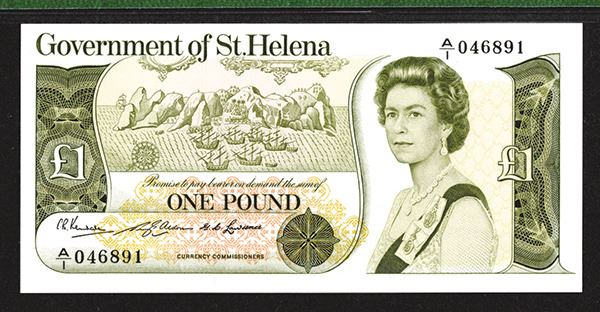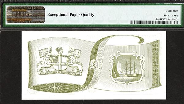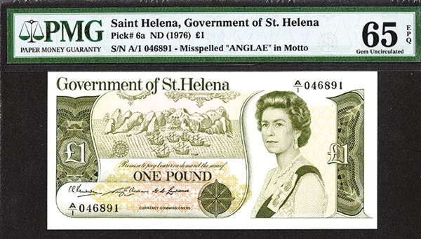 Saint Helena. 1 Pound. P-6a. Elizabeth II at right end. Incorrect spelling ANGLAE in motto on back. PMG graded Gen Uncirculated 65 EPQ.