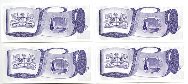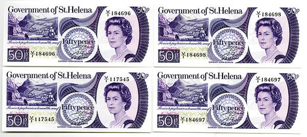 St. Helena, Lot of 4 notes, all are 50 Pence, P-5a, 1979 Issues, all in purple with Queen Elizabeth at right, all are V/1 prefix with 3 of them sequential with S/N's V/1 184696 to 698. All are in CU to Gem Unc. (4)