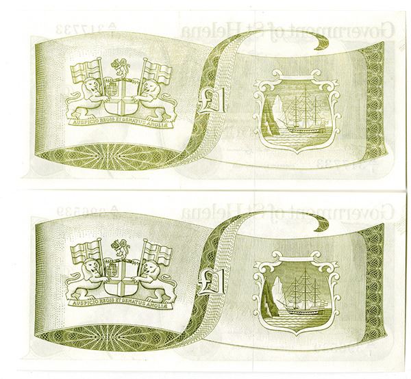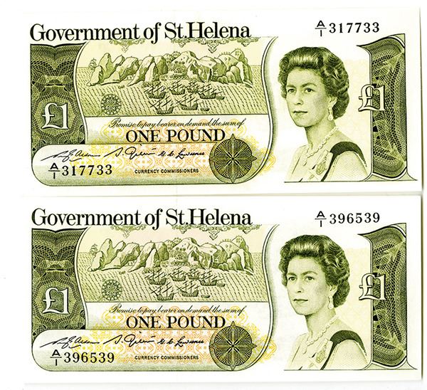 St. Helena, Lot of 2 notes, Both are £1, P-9a, 1981 Issues, all in olive green with Queen Elizabeth at right, all have A/1 prefix and in CU to Gem Unc. Condition. (4)
