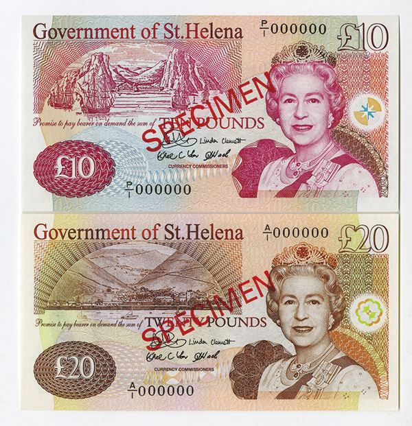 St. Helena, Lot of 2, 2004, Specimen notes, Includes, £10, P-12s, CU/Gem Unc.; £20, P-13s, CU/Gem Unc. Only 300 Specimens were printed for each issue. Attractive and rare pair of notes.