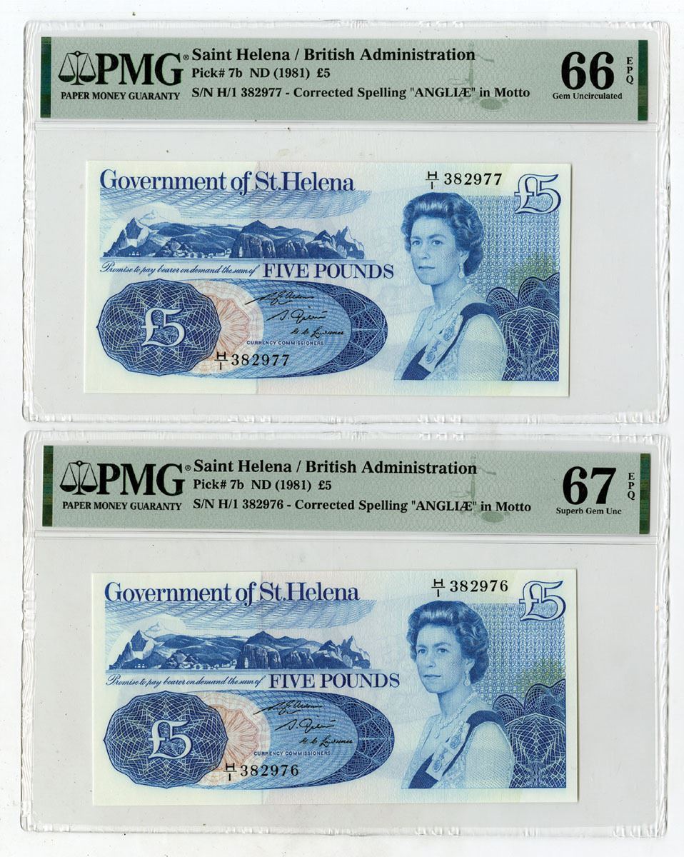 Saint Helena, ND (1998). 5 Pounds, P-7b (2), Sequential Pair of Issued Banknote, Blue on m/c underprint with portrait of Queen Elizabeth II at right, Back is blue with arms at left and right, S/Ns H/1 382976 & H/1 382977, Both notes are PMG graded, First is Superb Gem Uncirculated 67 EPQ and other is Gem Uncirculated 66 EPQ. (2). Sold "AS IS" no returns accepted.