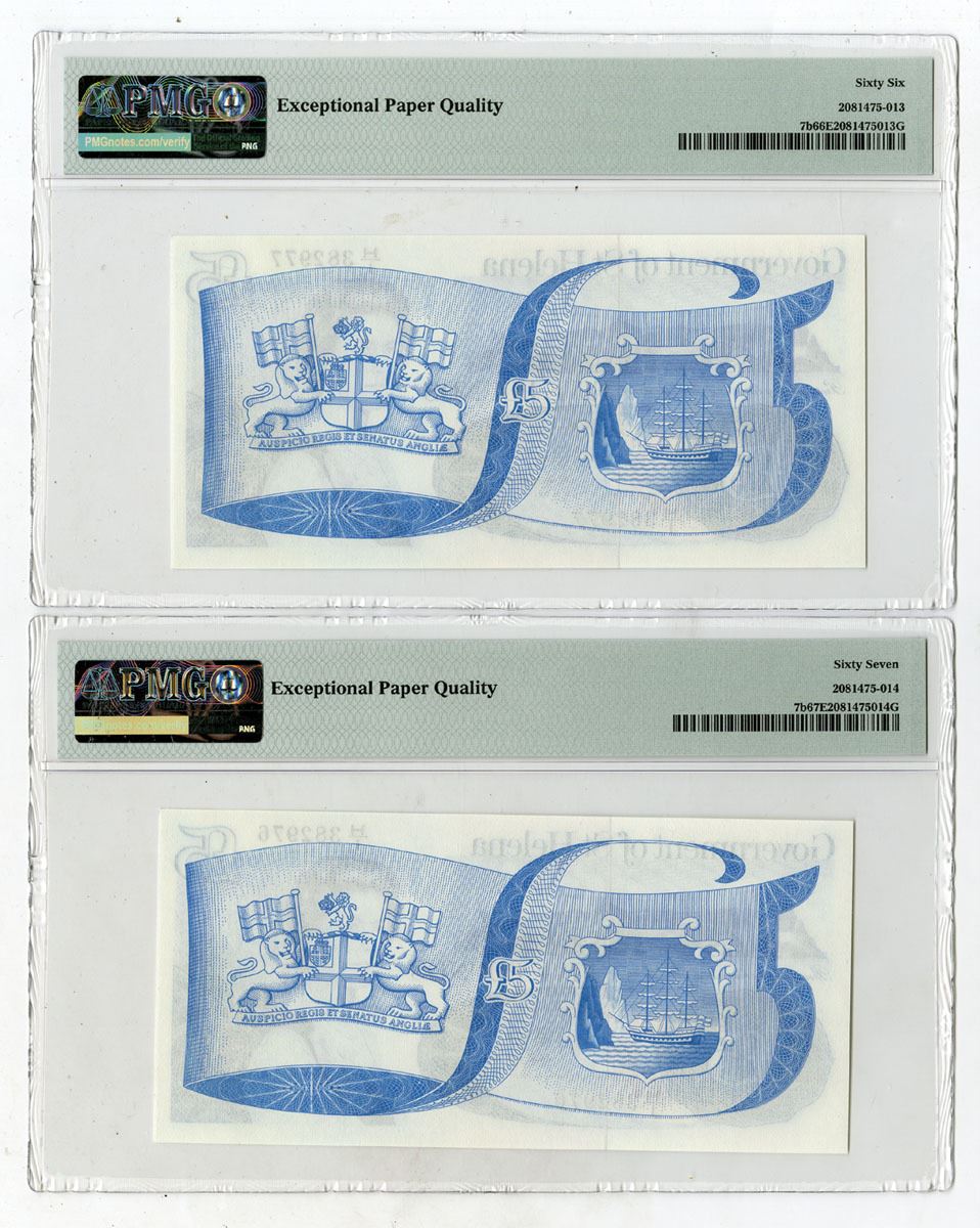 Saint Helena, ND (1998). 5 Pounds, P-7b (2), Sequential Pair of Issued Banknote, Blue on m/c underprint with portrait of Queen Elizabeth II at right, Back is blue with arms at left and right, S/Ns H/1 382976 & H/1 382977, Both notes are PMG graded, First is Superb Gem Uncirculated 67 EPQ and other is Gem Uncirculated 66 EPQ. (2). Sold "AS IS" no returns accepted.