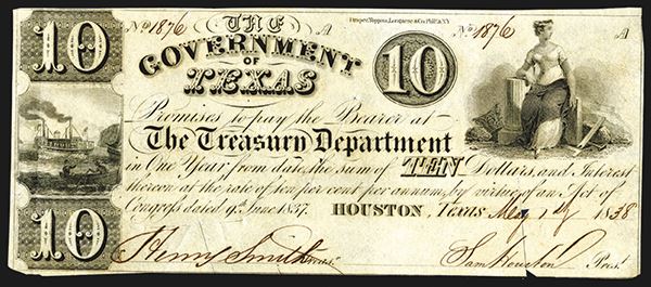Texas. $10. 1838. P-19. Steamboat at left, seated Industry at top right. Signed by Sam Houston. Cut cancelled three times, slight ink burn at serial numbers and start of Henry Smith signature. Fine.