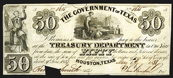 Texas. $50. 1838. P-21. Sailor with flag seated at left, Justice seated at top center. Signed by Sam Houston. Cut cancelled three times. Very Good to Fine, paper loss at Henry Smith signature.