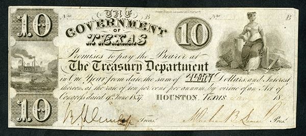 Houston, Texas, 10 Dollars, S/N 1838, issued in Houston, signed by Treasurer and President. Very Fine condition with the usual cut cancels. DTLC.