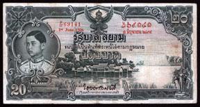 Lot of 3 notes, all are 1936 dated notes, 20 Baht, P-29, issued. Green face with portrait of King Rama VIII as boy, 3/4 facing left, back green with temple and pagoda on island. Dates include May1st, May 29th and June 1st, 1936. Condition varies from VF to VF+ with one having a rubber band or string toning on back that could possibly be removed and one with graffiti on back that is unobtrusive. Nice attractive group of notes with fresh colors, crisp paper and decent eye appeal. TDLR.