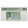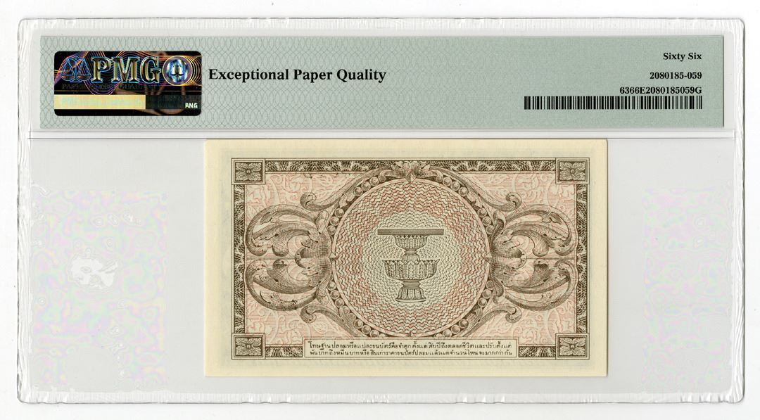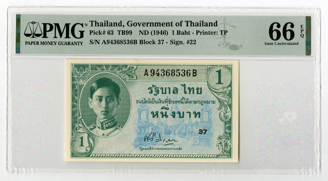 Thailand. ND (1946). 1 Baht, P-63 TB99, Issued banknote, Green on light blue underprint, S/N A94368536B Block 37, Sign. #22, PMG graded Gem Uncirculated 66 EPQ. Printer: TP. Rack and Price has no record of any notes grading this high offered previously at auction