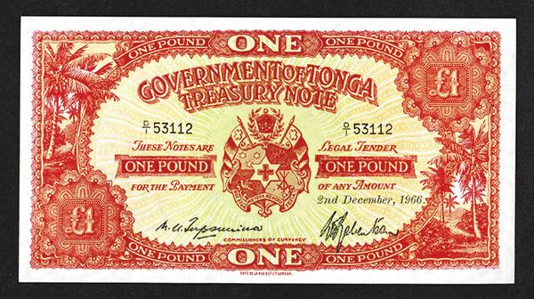 Tonga. 1 Pound. P-11e. 2.12.1966. Arms at center, two signatures below. Nice large format note, bold embossing. Choice About Uncirculated.