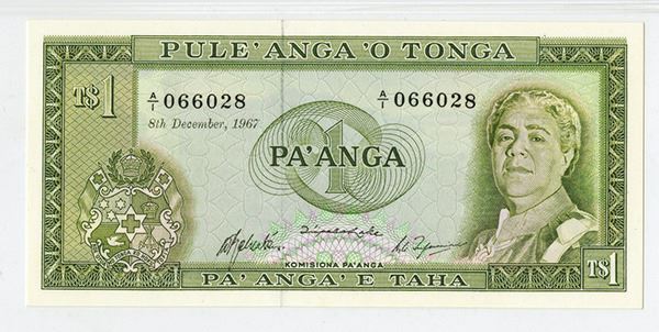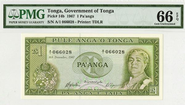 Tonga, 1 Pa'anga, P-14b, Issued banknote olive green on m/c, S/N A/1 066028, PMG graded Gem Uncirculated 66 EPQ. Nice note with large even margin, bright colors and sharp corners. TDLR.