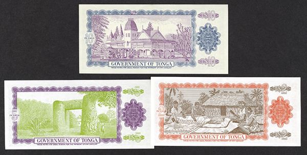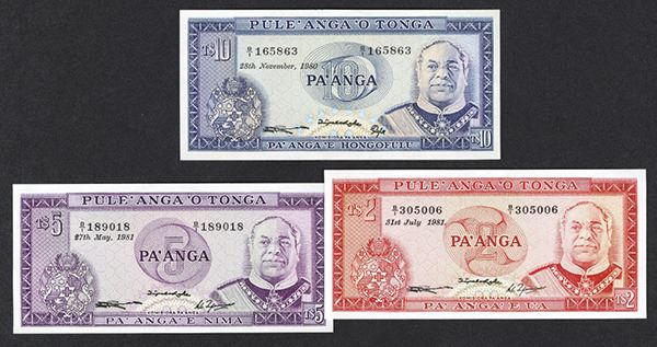 Tonga, lot includes 2 Pa'anga, P-20c; 5 Pa'anga, P-21c; and 10 Pa'anga, P-22c. All UNC. To CU.