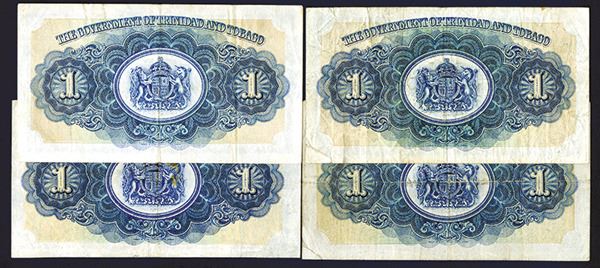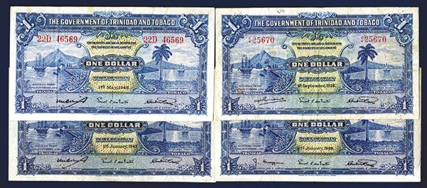 Trinidad & Tobago. 1 Pound. Sailing ship in harbor at left and right. 1.9.1935; 2.1.1939; 1.5.1942, 1.1.1943. A nice variety group for P-5 including the scarce first date of the type. Very Good-Fine. 4 pieces.