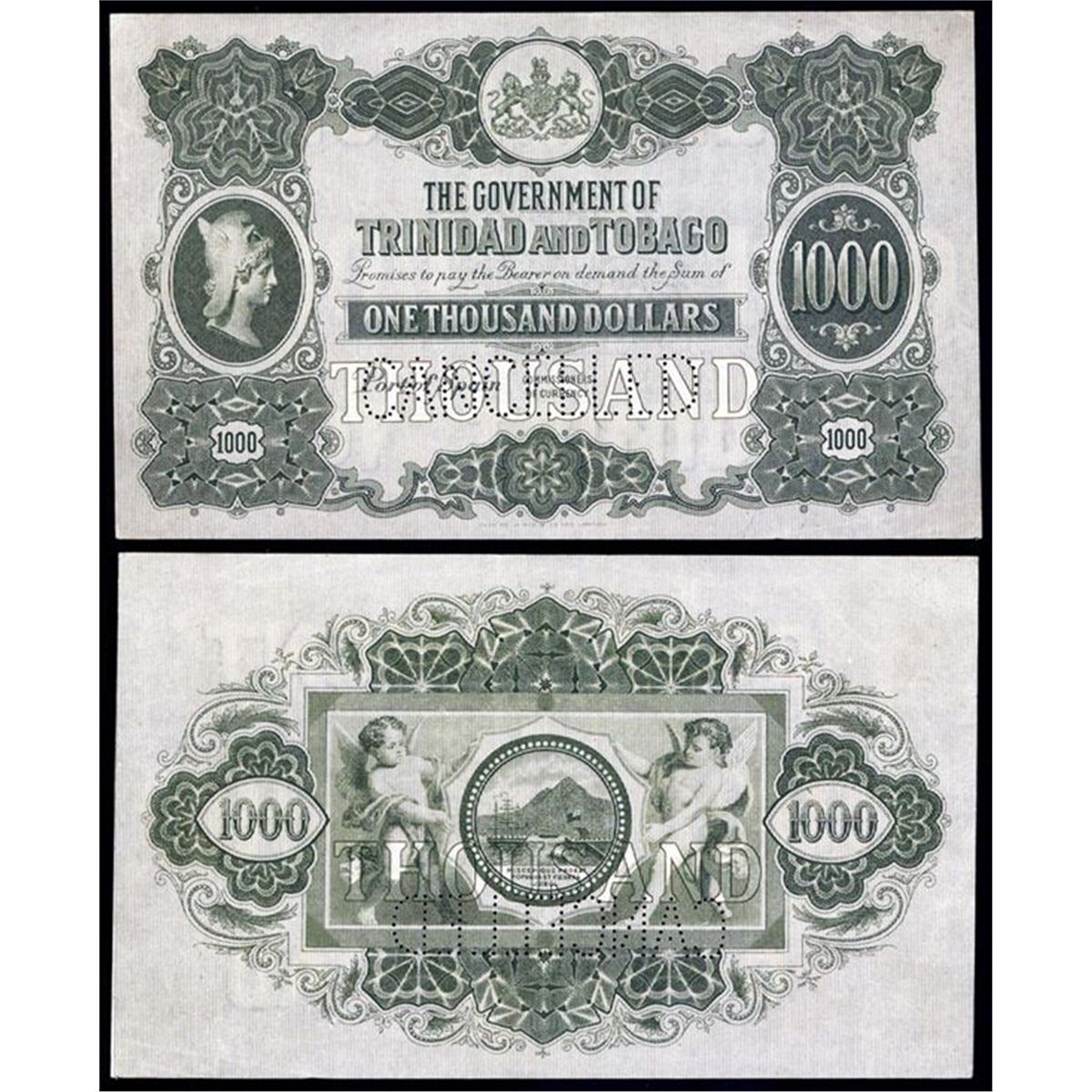 Trinidad & Tobago, (1914), $1000 , P-2E Unlisted Specimen note, Dark green on light green, Listed in SCWPM as black instead of this examples green color and listed as uniface proofs and this note is a double sided specimen with front and back together as an issued note would be released, Royal Arms at top center, Helmeted female head at left, back green on light green with cherubs supporting seal on back. Issued by the Government of Trinidad & Tobago just prior to WWI for reasons unknown. Quite similar to but more attractive than the Straits Settlements $1000 and $10,000 notes issued about the same time. The only other note known is the former Crown Agent's example held at the British Library. An exceptional note, extremely large size and a superb design. In Trinidad as in Canada prior to the opening of the central bank of Canada. This is an exceptional opportunity to acquire a note formerly uncollectable. TDLR.