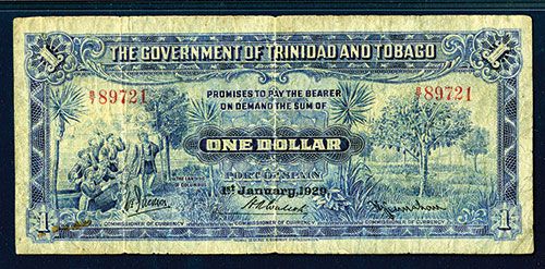 Trinidad & Tobago, January 1st, 1929, $1, P-3, Issued banknote, S/N B/7 89721, PMG graded Very Good 10 NET with notation of rust spot on back lower left corner, otherwise large margins, bright colors and solid intact borders, Scarce note in any condition. TDLR. One of 3 graded by PMG.