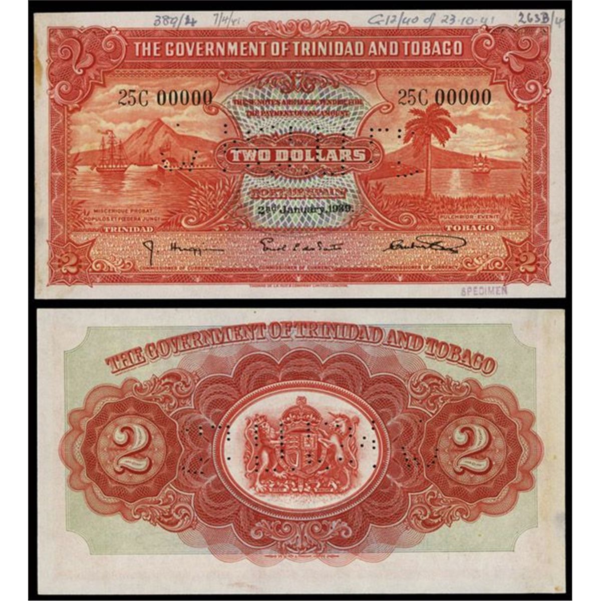 Port of Spain, Trinidad and Tobago, 2nd January 1939, $2, P-6b, Unlisted Specimen banknote, bright red on m/c, sailing ships and harbor scenes on left and right, S/N - 25C 00000, Pin-punch CANCELLED with handstamp small SPECIMEN on bottom right margin, archival notations on top margin, Light stains from previous mounting on left margin otherwise the note looks Uncirculated to almost CU condition. Scarce specimen. TDLR.