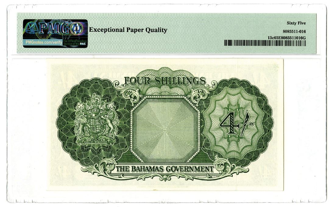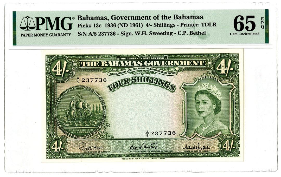 Bahamas. 1936 (ND 1961). 4/- Shillings, P-13c, Issued banknote, Green, S/N A/5 237736 - Sign. W.H. Sweeting - C.P. Bethel, PMG graded Gem Uncirculated 65 EPQ. Printer: TDLR.