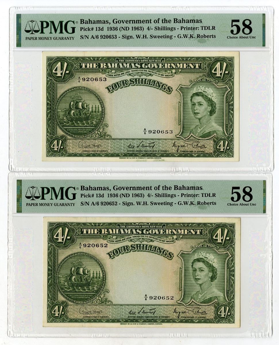 Bahamas, 1936 (ND 1963). 4/- Shillings, P-13d (2), Sequential Pair of Issued Banknotes, Green on pale pink underprint with Queen Elizabeth II at right and sailing ship at left, Back is dark green print, S/Ns A/6 920652 & A/6 920653, Both notes are PMG graded Choice About Unc 58, TDLR. (2). Sold "AS IS" no returns accepted.