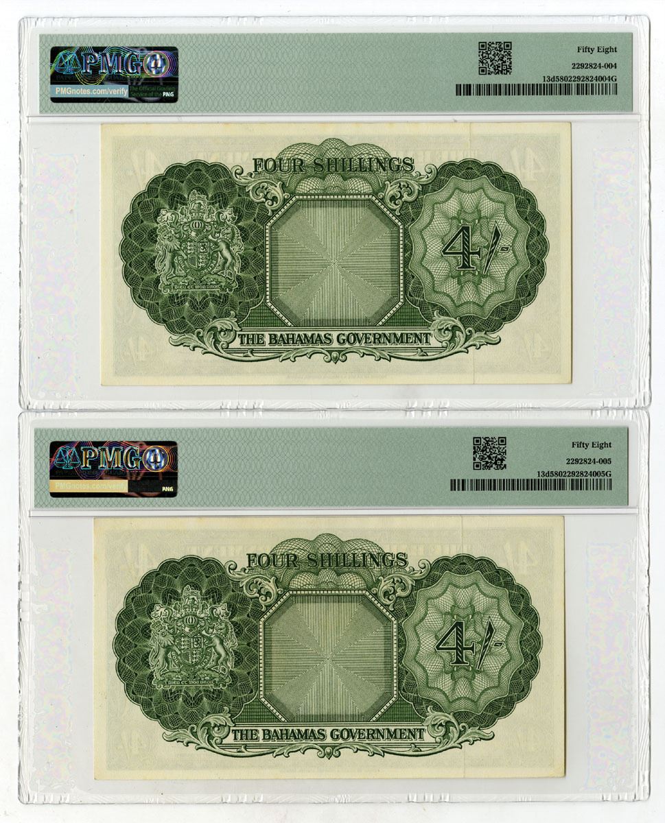 Bahamas, 1936 (ND 1963). 4/- Shillings, P-13d (2), Sequential Pair of Issued Banknotes, Green on pale pink underprint with Queen Elizabeth II at right and sailing ship at left, Back is dark green print, S/Ns A/6 920652 & A/6 920653, Both notes are PMG graded Choice About Unc 58, TDLR. (2). Sold "AS IS" no returns accepted.