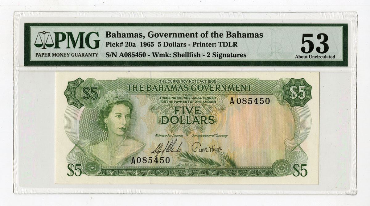 Bahamas, 1965. 5 Dollars, P-20a, Issued Banknote, Pale green on m/c underprint with portrait of Queen Elizabeth II at left, Back is m/c with statue of Columbus at center, S/N A085450, PMG graded About Uncirculated 53, TDLR.