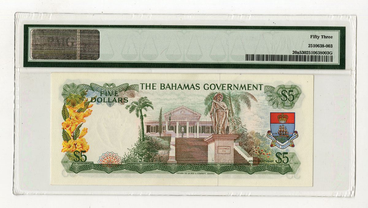 Bahamas, 1965. 5 Dollars, P-20a, Issued Banknote, Pale green on m/c underprint with portrait of Queen Elizabeth II at left, Back is m/c with statue of Columbus at center, S/N A085450, PMG graded About Uncirculated 53, TDLR.