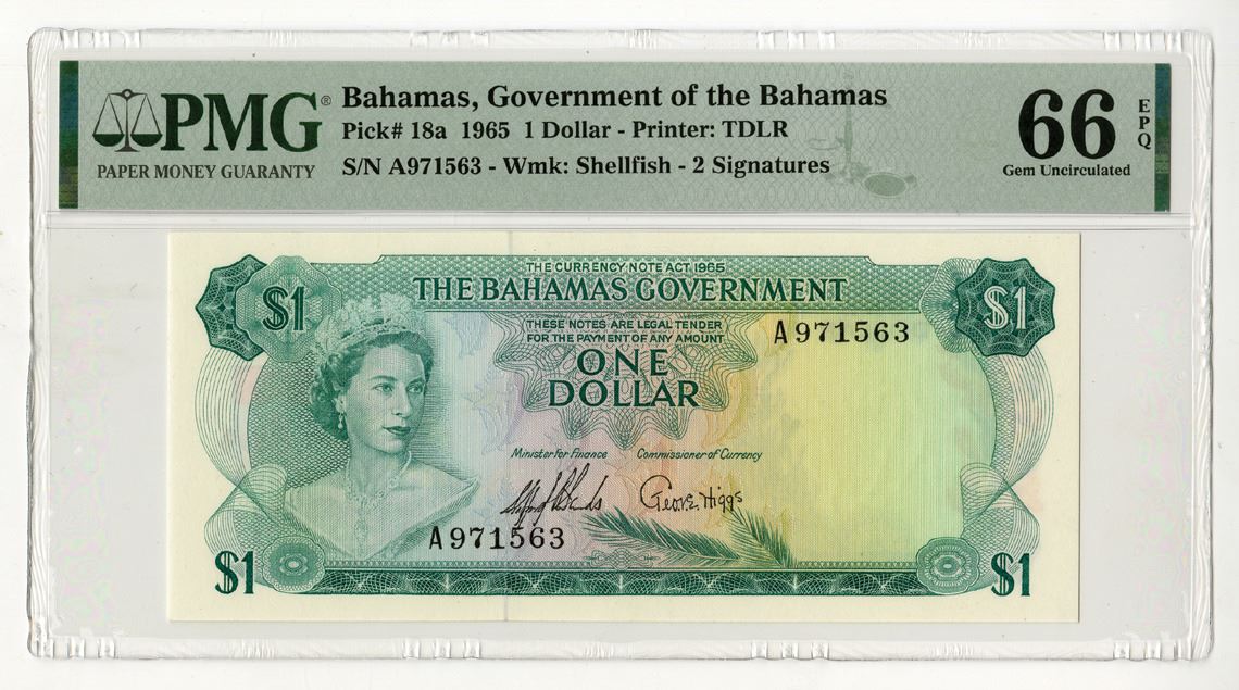 Bahamas, 1965. 1 Dollar, P-18a, Issued Banknote, Green on multicolor underprint with portrait of Queen Elizabeth II at left, Back is m/c with under water scene at center, S/N A971563, PMG graded Gem Uncirculated 66 EPQ, TDLR.