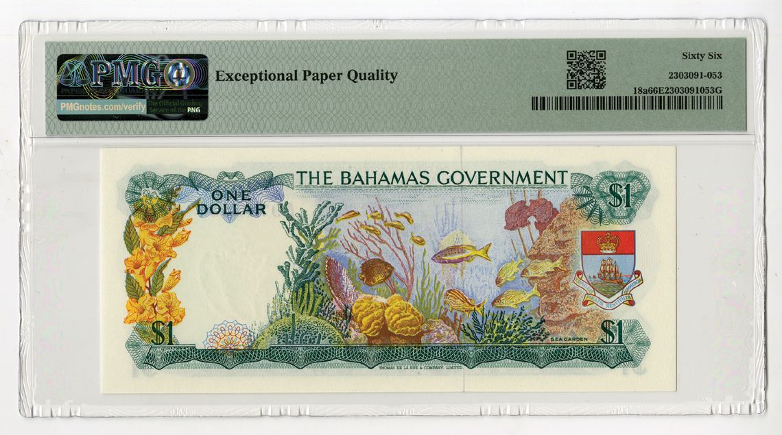 Bahamas, 1965. 1 Dollar, P-18a, Issued Banknote, Green on multicolor underprint with portrait of Queen Elizabeth II at left, Back is m/c with under water scene at center, S/N A971563, PMG graded Gem Uncirculated 66 EPQ, TDLR.