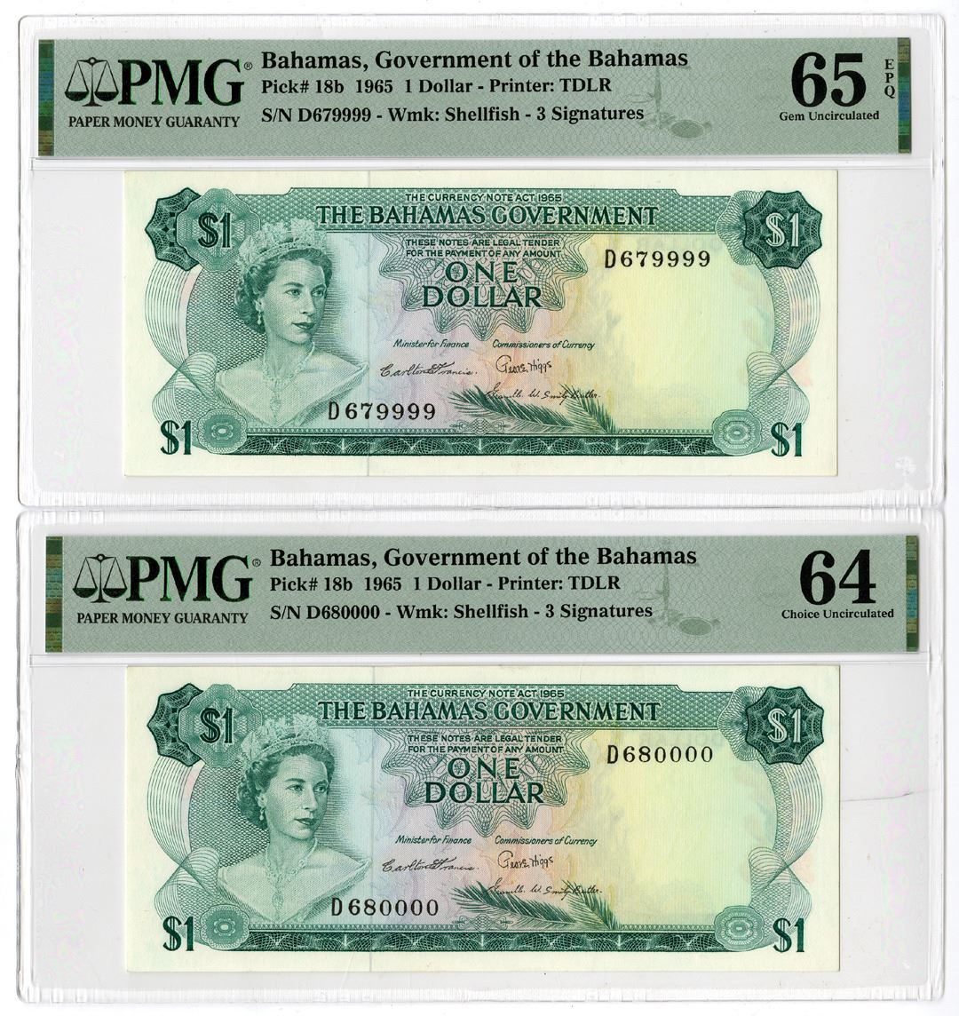 Bahamas, 1965. Pair of Sequential $1, P-18b, Issued Banknotes, Green on m/c underprint with portrait of Queen Elizabeth II at left, Transition S/Ns D679999 & D680000 add to the desirability of this pair, Both are PMG graded one is Gem Unc 65 EPQ & the second is Choice Unc 64, Printer: TDLR. (2). Sold "AS IS" no returns accepted.