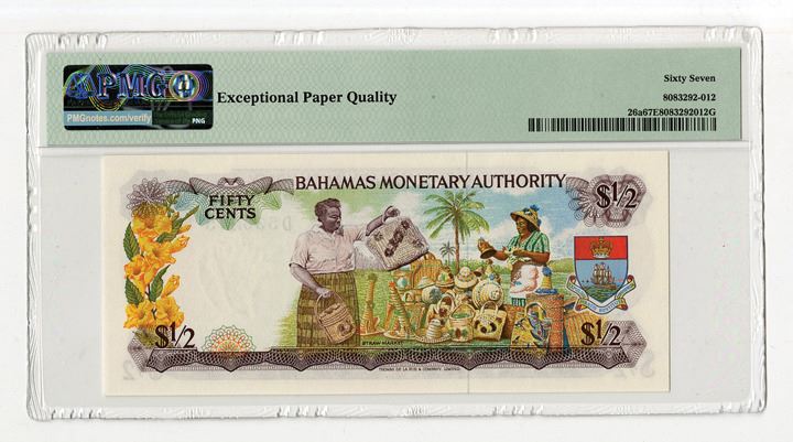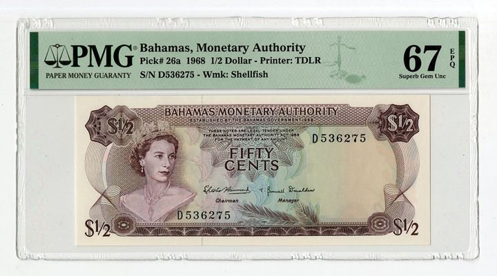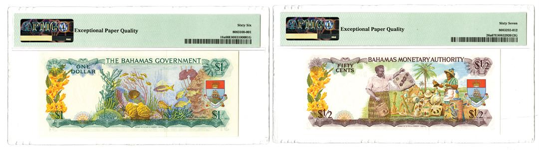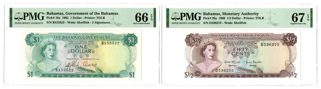 Bahamas. Lot of 2 Issued banknotes, Includes: 1965, Government of the Bahamas, 1 Dollar, P-18a, Green on multicolor underprint, S/N B153522, Watermark: Shellfish, 2 Signatures, PMG graded Gem Uncirculated 66 EPQ; and, 1968, Bahamas Monetary Authority, 1/2 Dollar, P26a, Purple on multicolor underprint, S/N D536275, Watermark: Shellfish, PMG graded Superb Gem Uncirculated 67 EPQ. (2)