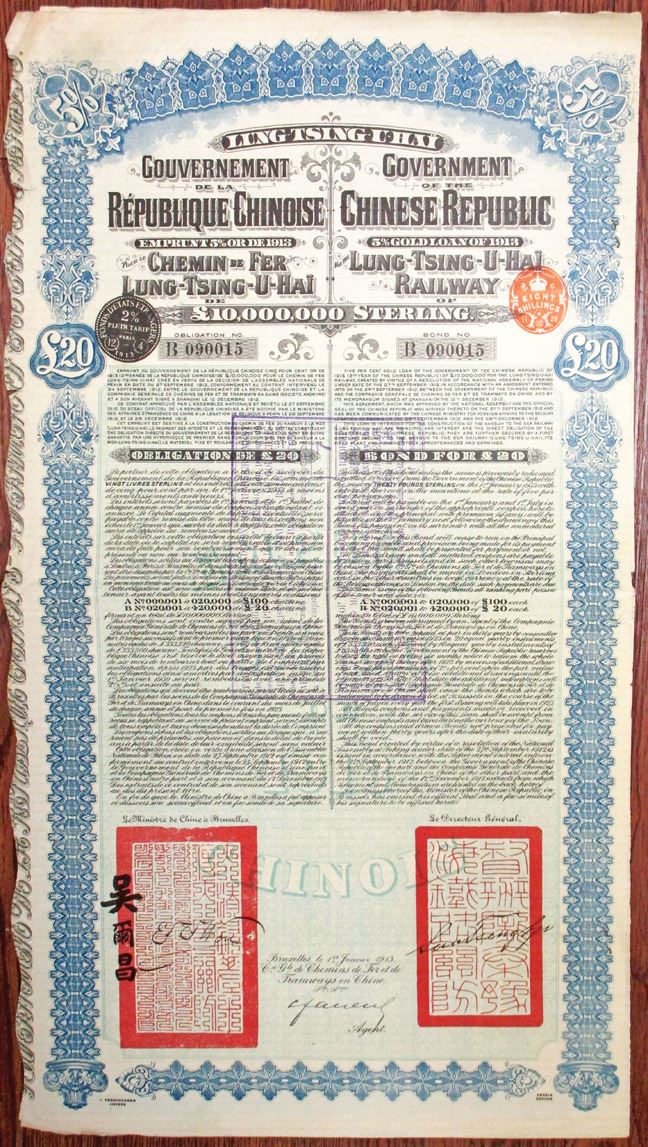 China, 1913. 20 Pounds I/U 5% Lung-Tsing-U-Hai Railway Coupon Bond, Black printing with blue border and undertint. VF condition, J. Verschueren Anvers.