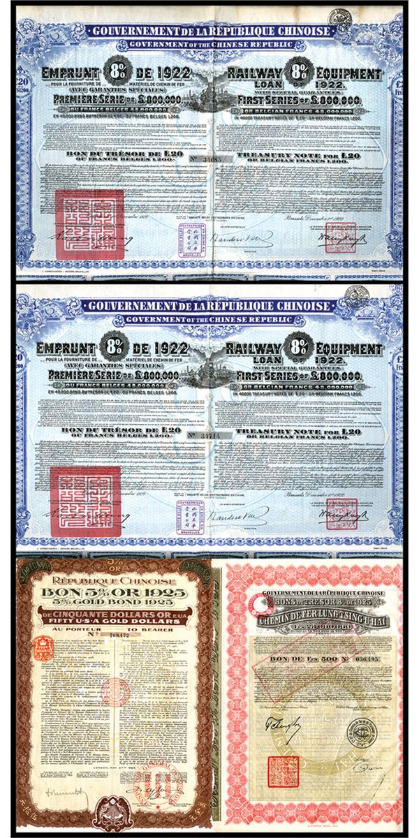Lot of 4 bonds, Included are 1922 issues, 8% Railway Equipment, 20 Pound Bond Pair, Black on light blue, uncancelled, VF condition; 1925, Chemin De Fer Lung Tsing-U-Hai, 500 Francs, 8% Bond, red on light olive, VF; and, Republic Chinois, 1925, 5% Gold Dollar Bond, Uncancelled, VF.