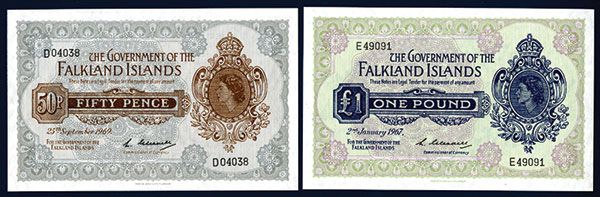 Lot of 2 notes, Includes Falkland Islands, 2nd January 1967, 1 Pound, P-8a, Issued banknote, blue on gray-green and lilac underprint, Queen Elizabeth II on right, back blue, S/N E49091, Uncirculated with large even margins, this is also the Pick Plate note in the SCWPM; also included is a 1969, 50 Pence, P-10a, Issued, Choice to Gem uncirculated. Attractive Falklands pair.