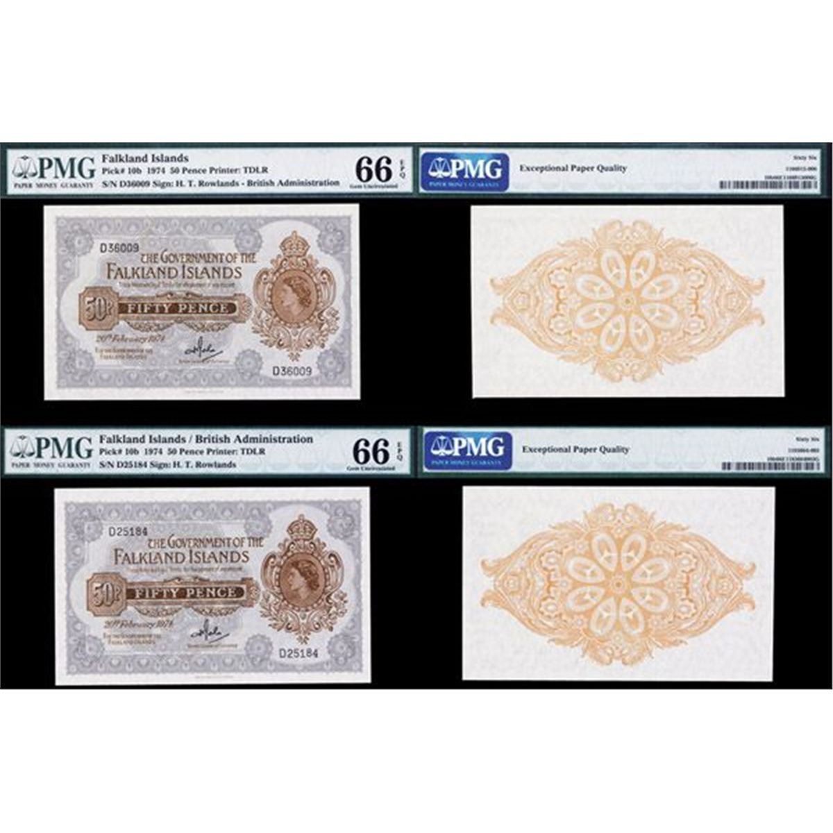 Falkland Islands, 1974, Lot of 2 notes, both are 50 Pence, P-10b, Issued, both are PMG graded Gem Uncirculated 66 EPQ (Exceptional Paper Quality), Scarce notes in beautiful condition that will be difficult to improve upon. TDLR.