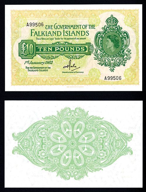 Falkland Islands, 1st January 1982, 10 Pounds, P-11b, Issued banknote, green on light orange and yellow-green underprint, Queen Elizabeth II on right, back turquoise green, S/N A99506, Choice to Gem Uncirculated, lovely example with large even margins, bright colors and exceptional paper quality, a superior example for the issue that will be difficult to improve upon. TDLR.